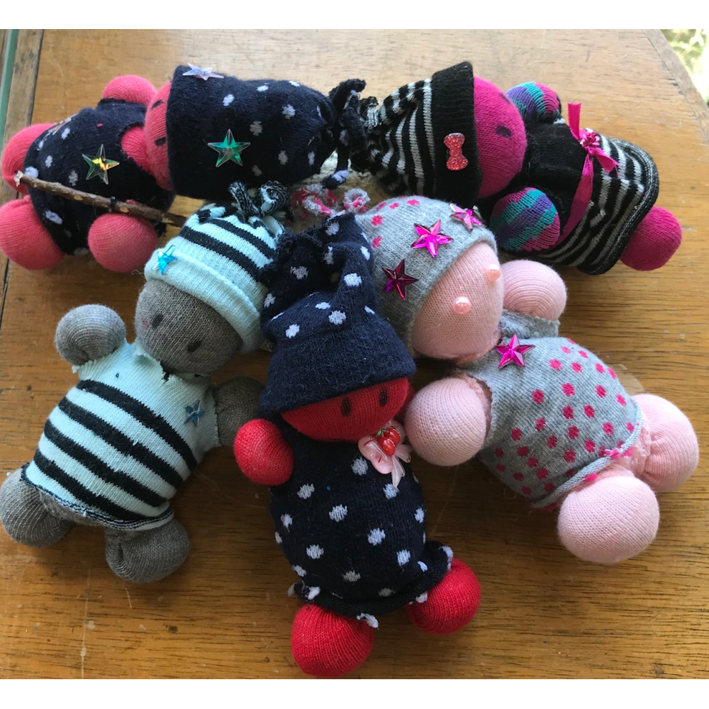 Ze worden gemaakt van gerecyclede kindersokjes en zijn gevuld met gedroogde kruiden (lavendel, lijsterbes, rozemarijn etc) en een heksenspreuk voor mooie dromen!