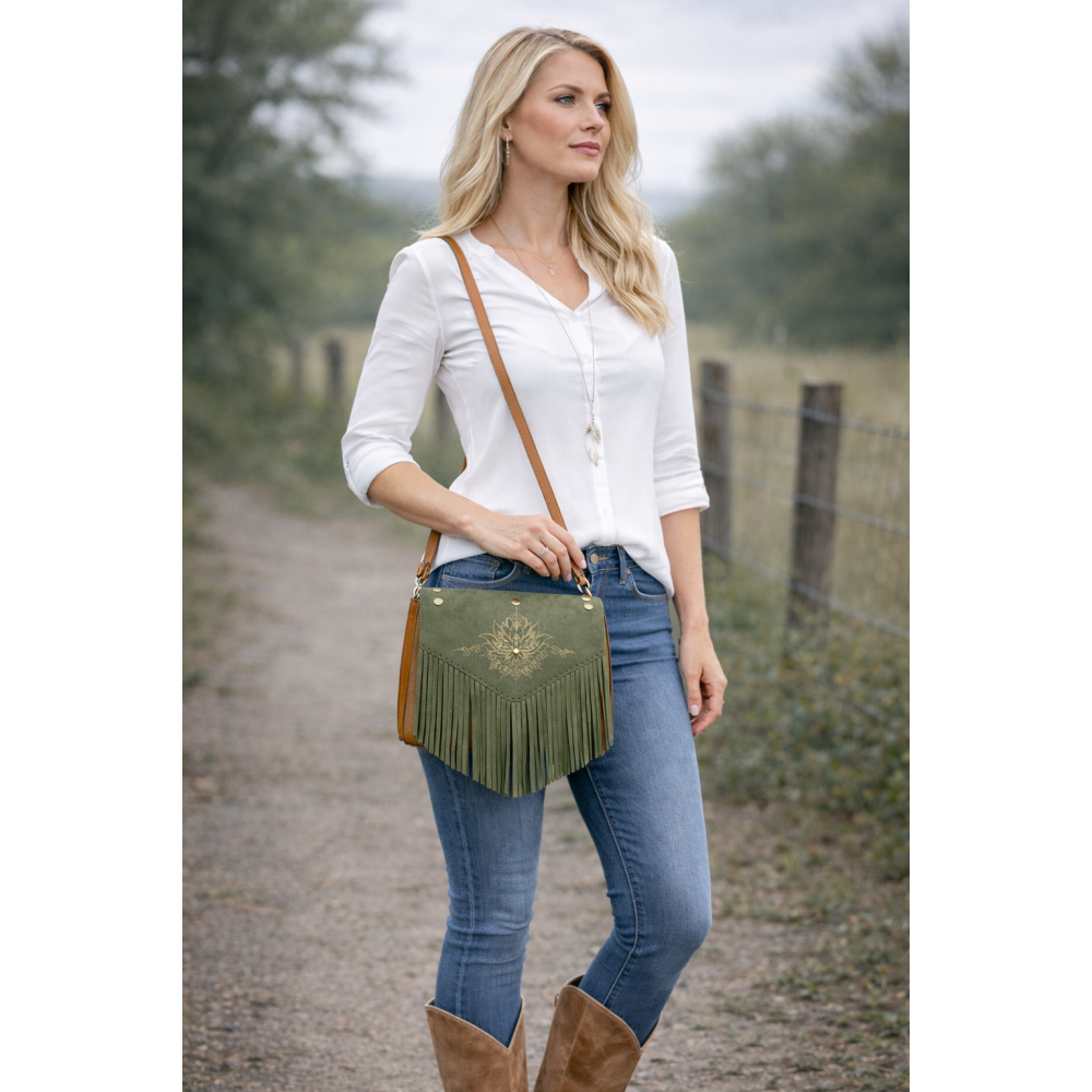 Leren crossbodytas met franjes – legergroen glad leer