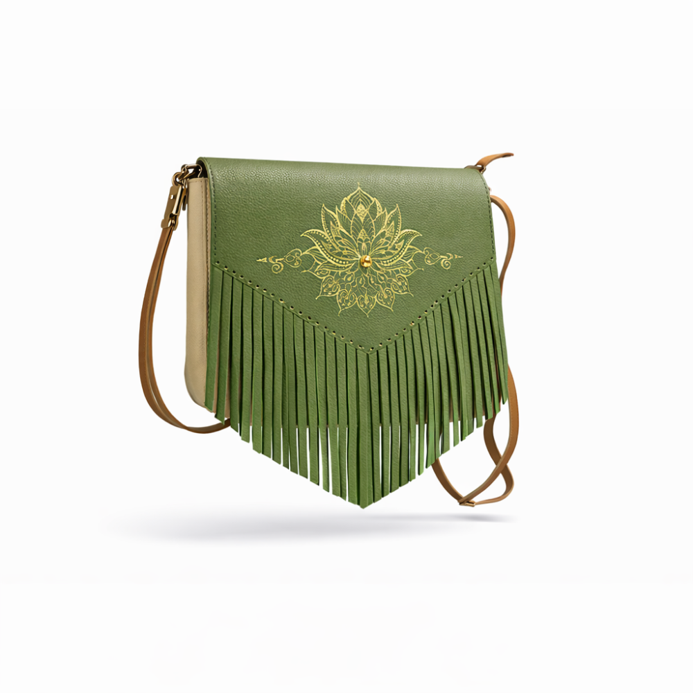 Deze leren crossbodytas is gemaakt van herbruikt leer en heeft een rustige, natuurlijke uitstraling met een subtiele boho touch. Het groene leren front is strak en egaal afgewerkt en voorzien van een verfijnde gouden lotus gravure in het midden. De franjes geven de tas beweging en karakter, zonder dat het ontwerp druk wordt.