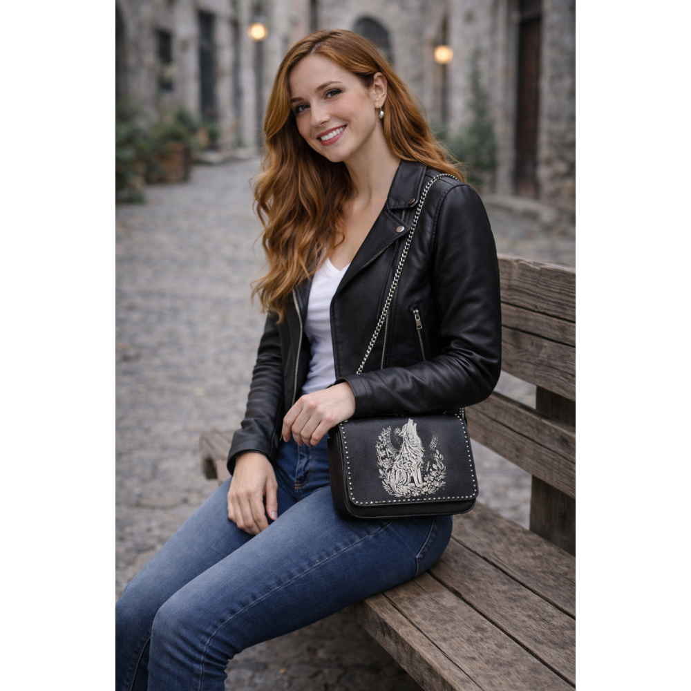 Zwart leren frontje met wolf – intuïtie, bescherming en innerlijke kracht
