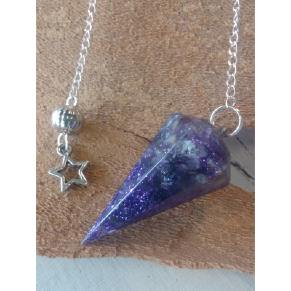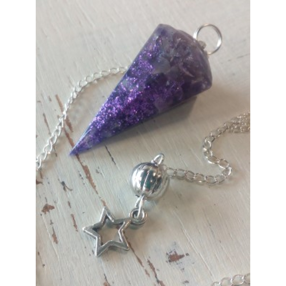 Door de combinatie van hars, metalen en mineralen heeft deze pendel de kracht van een Orgonite. Hij zuivert zijn omgeving van stralingen wat het werken met een pendel makkelijker maakt voor beginners. Deze pendel is handgemaakt en is gevuld met Amethyst. Inclusief ketting is hij 31 centimeter lang.