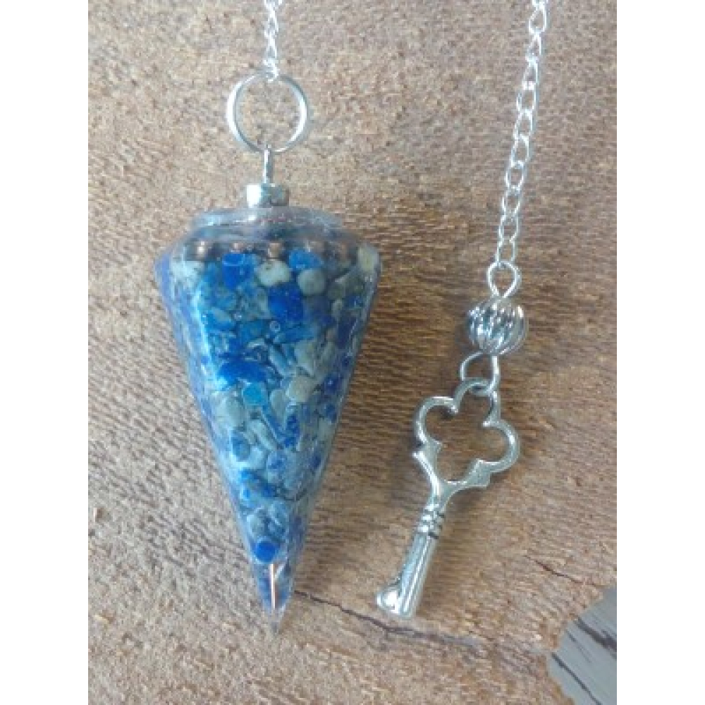 Door de combinatie van hars, metalen en mineralen heeft deze pendel de kracht van een Orgonite. Hij zuivert zijn omgeving van stralingen wat het werken met een pendel makkelijker maakt voor beginners. Deze pendel is handgemaakt. In de Lapis Lazuli zit een koperen spiraal verborgen. Inclusief ketting is hij 26 centimeter lang.