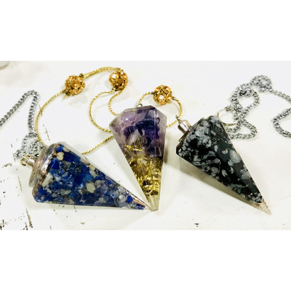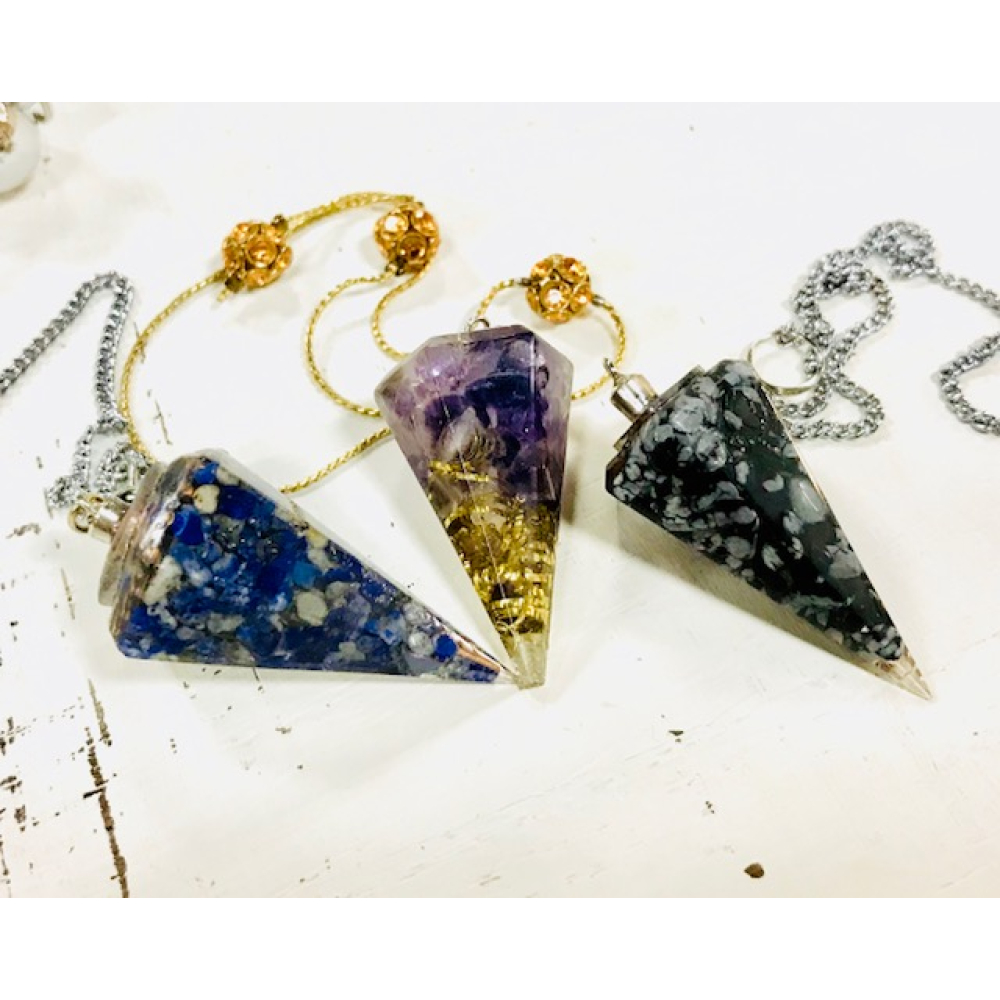 Door de combinatie van hars, metalen en mineraalstenen maak je een zeer krachtige pendel.